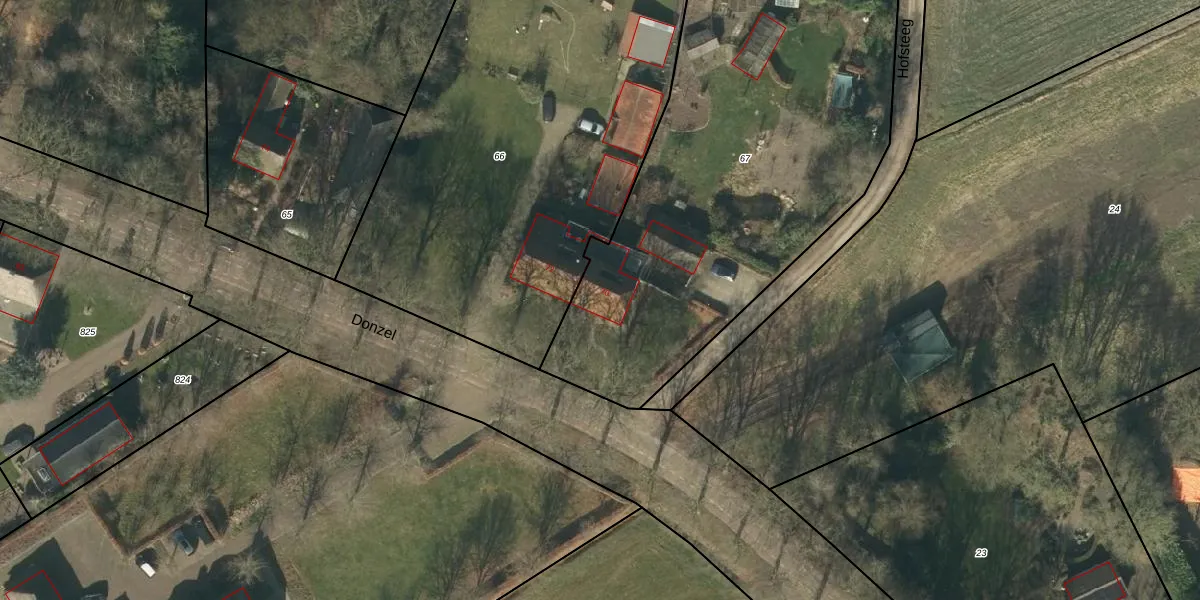 Het perceel waarop Donzel 70 staat heeft een oppervlakte van 2310 m². Dit is een zeer groot perceel. De perceeloppervlakte wordt geregistreerd door het Kadaster. Gedetailleerde informatie over de maten van dit perceel kunt u vinden in het rapport Kadastrale kaart met maatvoering van Donzel 70.