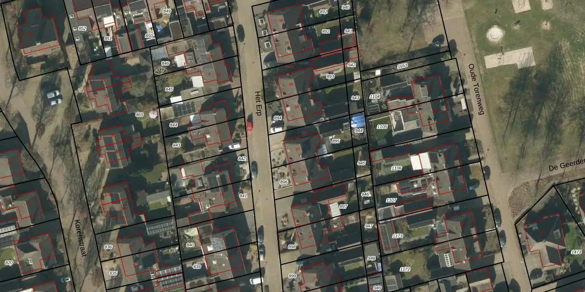 Het perceel waarop Het Erp 22 staat heeft een oppervlakte van 313 m². Dit is een groot perceel. De perceeloppervlakte wordt geregistreerd door het Kadaster. Gedetailleerde informatie over de maten van dit perceel kunt u vinden in het rapport Kadastrale kaart met maatvoering van Het Erp 22.