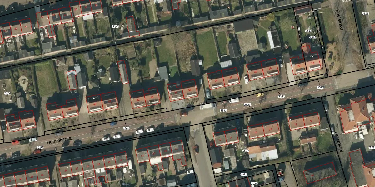 Heuvelstraat 36 is gelegen op kadastraal perceel NTR00C3988. Deze kadastrale aanduiding is uniek en wordt gebruikt door het Kadaster om eigendomsrechten en andere zakelijke rechten vast te leggen. Het perceel maakt onderdeel uit van de kadastrale gemeente Nistelrode.