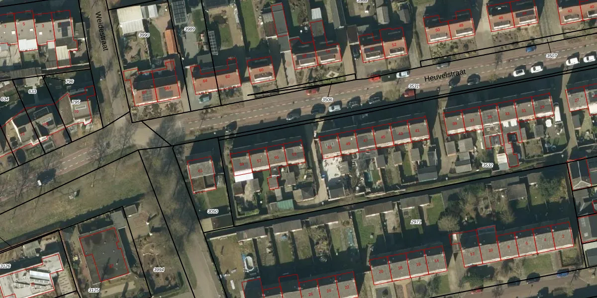 Het perceel waarop Heuvelstraat 53 staat heeft een oppervlakte van 4272 m². Dit is een zeer groot perceel. De perceeloppervlakte wordt geregistreerd door het Kadaster. Gedetailleerde informatie over de maten van dit perceel kunt u vinden in het rapport Kadastrale kaart met maatvoering van Heuvelstraat 53.