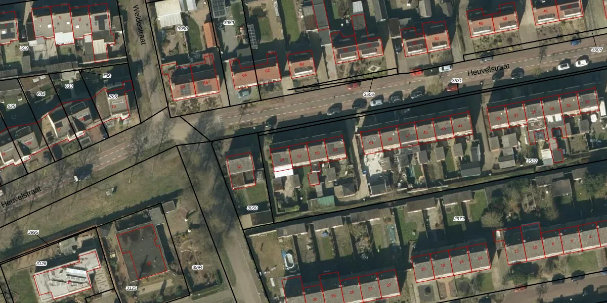 Het perceel waarop Heuvelstraat 57 staat heeft een oppervlakte van 4272 m². Dit is een zeer groot perceel. De perceeloppervlakte wordt geregistreerd door het Kadaster. Gedetailleerde informatie over de maten van dit perceel kunt u vinden in het rapport Kadastrale kaart met maatvoering van Heuvelstraat 57.
