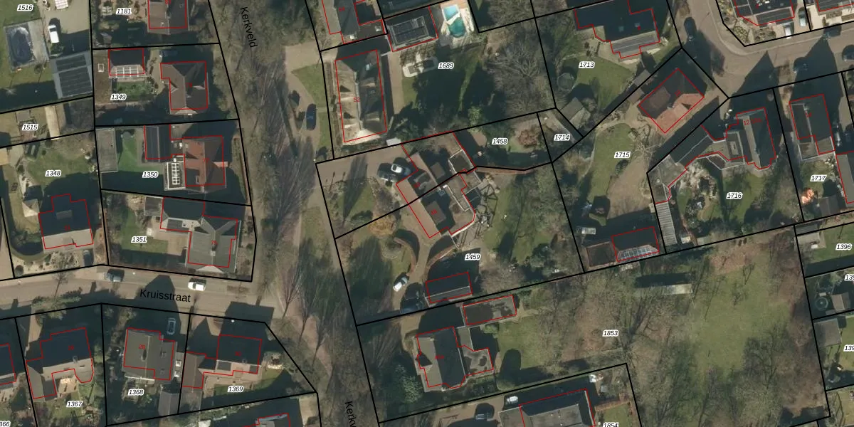 Het perceel waarop Kerkveld 48 staat heeft een oppervlakte van 1410 m². Dit is een zeer groot perceel. De perceeloppervlakte wordt geregistreerd door het Kadaster. Gedetailleerde informatie over de maten van dit perceel kunt u vinden in het rapport Kadastrale kaart met maatvoering van Kerkveld 48.