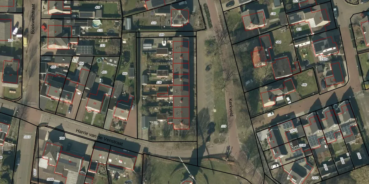 Het perceel waarop Kerkveld 7 staat heeft een oppervlakte van 1840 m². Dit is een zeer groot perceel. De perceeloppervlakte wordt geregistreerd door het Kadaster. Gedetailleerde informatie over de maten van dit perceel kunt u vinden in het rapport Kadastrale kaart met maatvoering van Kerkveld 7.
