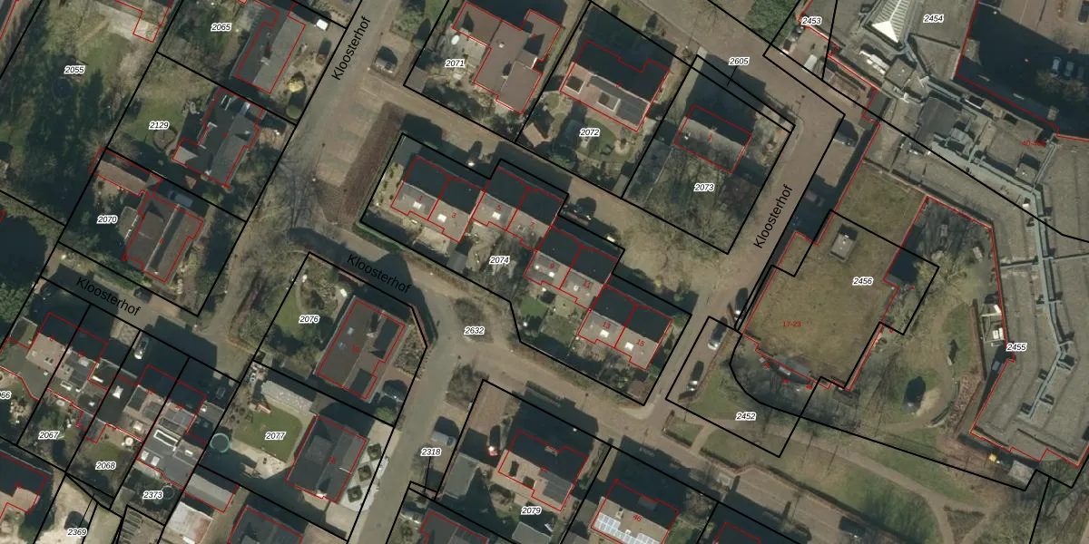 Het perceel waarop Kloosterhof 9 staat heeft een oppervlakte van 1265 m². Dit is een zeer groot perceel. De perceeloppervlakte wordt geregistreerd door het Kadaster. Gedetailleerde informatie over de maten van dit perceel kunt u vinden in het rapport Kadastrale kaart met maatvoering van Kloosterhof 9.