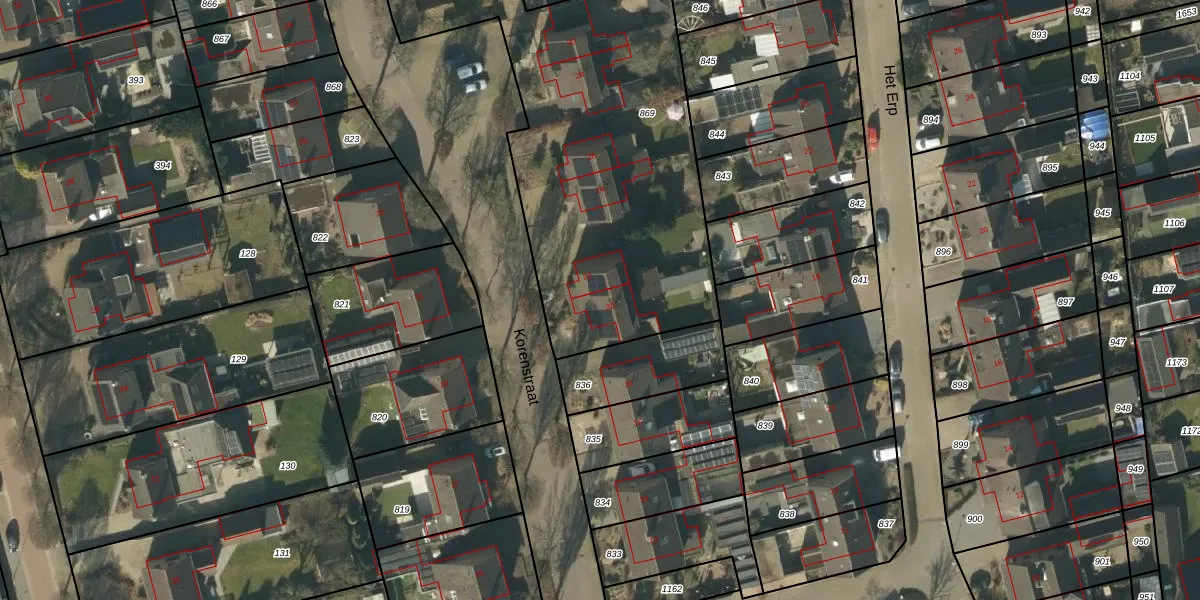 Het perceel waarop Korenstraat 20 staat heeft een oppervlakte van 2245 m². Dit is een zeer groot perceel. De perceeloppervlakte wordt geregistreerd door het Kadaster. Gedetailleerde informatie over de maten van dit perceel kunt u vinden in het rapport Kadastrale kaart met maatvoering van Korenstraat 20.
