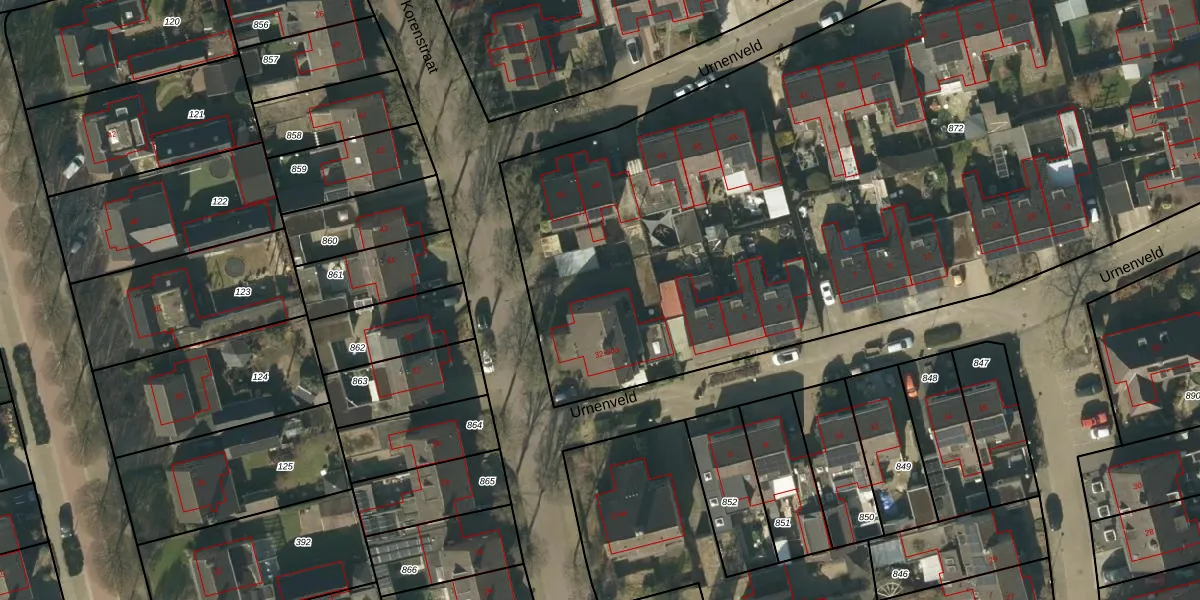 Het perceel waarop Korenstraat 34-a staat heeft een oppervlakte van 6010 m². Dit is een zeer groot perceel. De perceeloppervlakte wordt geregistreerd door het Kadaster. Gedetailleerde informatie over de maten van dit perceel kunt u vinden in het rapport Kadastrale kaart met maatvoering van Korenstraat 34-a.