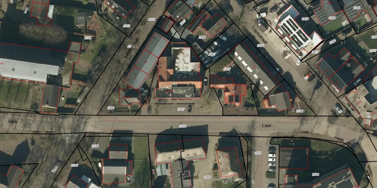 Het perceel waarop Laar 53-d staat heeft een oppervlakte van 1190 m². Dit is een zeer groot perceel. De perceeloppervlakte wordt geregistreerd door het Kadaster. Gedetailleerde informatie over de maten van dit perceel kunt u vinden in het rapport Kadastrale kaart met maatvoering van Laar 53-d.