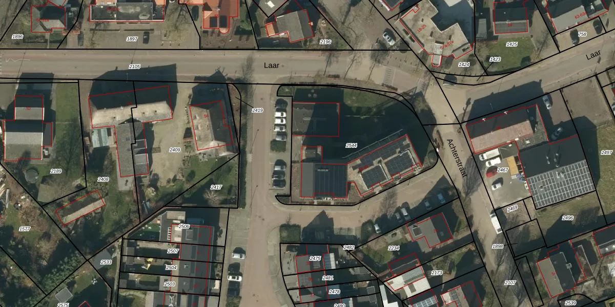 Het perceel waarop Laar 64 staat heeft een oppervlakte van 1510 m². Dit is een zeer groot perceel. De perceeloppervlakte wordt geregistreerd door het Kadaster. Gedetailleerde informatie over de maten van dit perceel kunt u vinden in het rapport Kadastrale kaart met maatvoering van Laar 64.