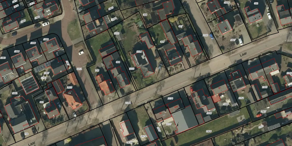 Het perceel waarop Laar 77 staat heeft een oppervlakte van 1118 m². Dit is een zeer groot perceel. De perceeloppervlakte wordt geregistreerd door het Kadaster. Gedetailleerde informatie over de maten van dit perceel kunt u vinden in het rapport Kadastrale kaart met maatvoering van Laar 77.