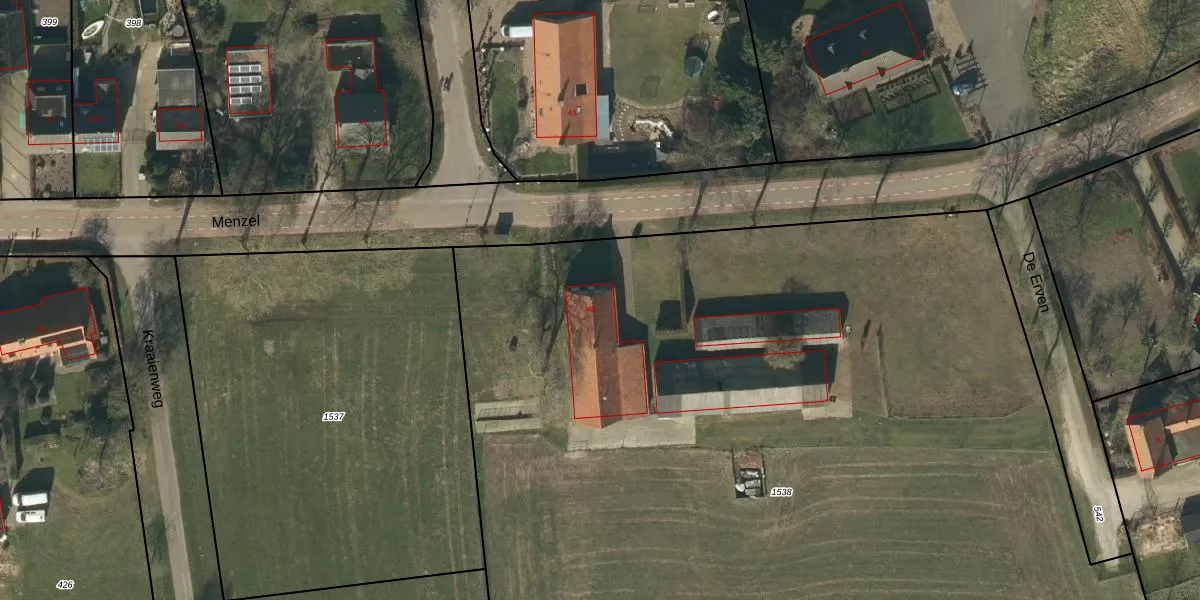 Het perceel waarop Menzel 48 staat heeft een oppervlakte van 7920 m². Dit is een zeer groot perceel. De perceeloppervlakte wordt geregistreerd door het Kadaster. Gedetailleerde informatie over de maten van dit perceel kunt u vinden in het rapport Kadastrale kaart met maatvoering van Menzel 48.