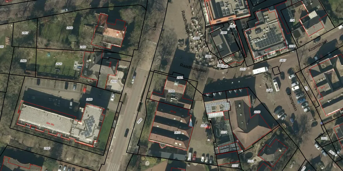 Het perceel waarop Raadhuisplein 1-b staat heeft een oppervlakte van 413 m². Dit is een groot perceel. De perceeloppervlakte wordt geregistreerd door het Kadaster. Gedetailleerde informatie over de maten van dit perceel kunt u vinden in het rapport Kadastrale kaart met maatvoering van Raadhuisplein 1-b.