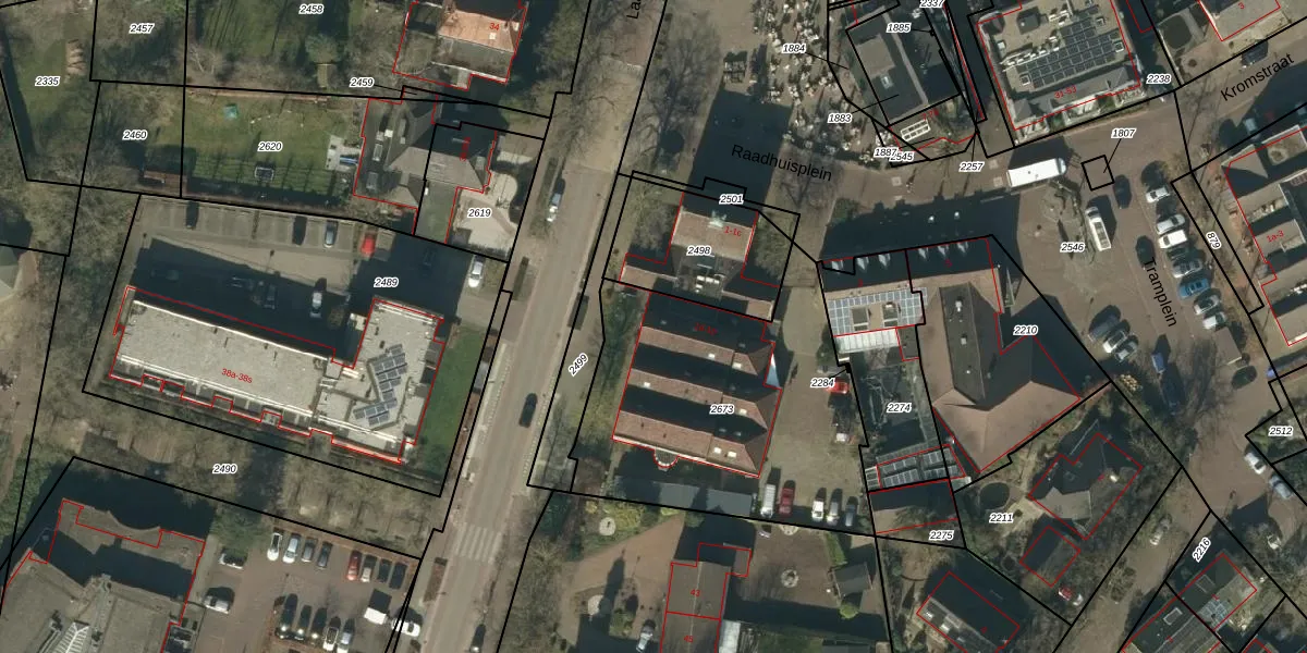 Het perceel waarop Raadhuisplein 1-e staat heeft een oppervlakte van 1368 m². Dit is een zeer groot perceel. De perceeloppervlakte wordt geregistreerd door het Kadaster. Gedetailleerde informatie over de maten van dit perceel kunt u vinden in het rapport Kadastrale kaart met maatvoering van Raadhuisplein 1-e.