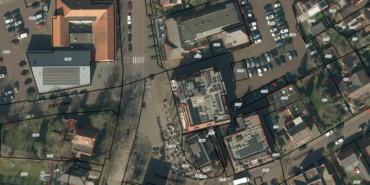 Het perceel waarop Raadhuisplein 13 staat heeft een oppervlakte van 811 m². Dit is een groot perceel. De perceeloppervlakte wordt geregistreerd door het Kadaster. Gedetailleerde informatie over de maten van dit perceel kunt u vinden in het rapport Kadastrale kaart met maatvoering van Raadhuisplein 13.