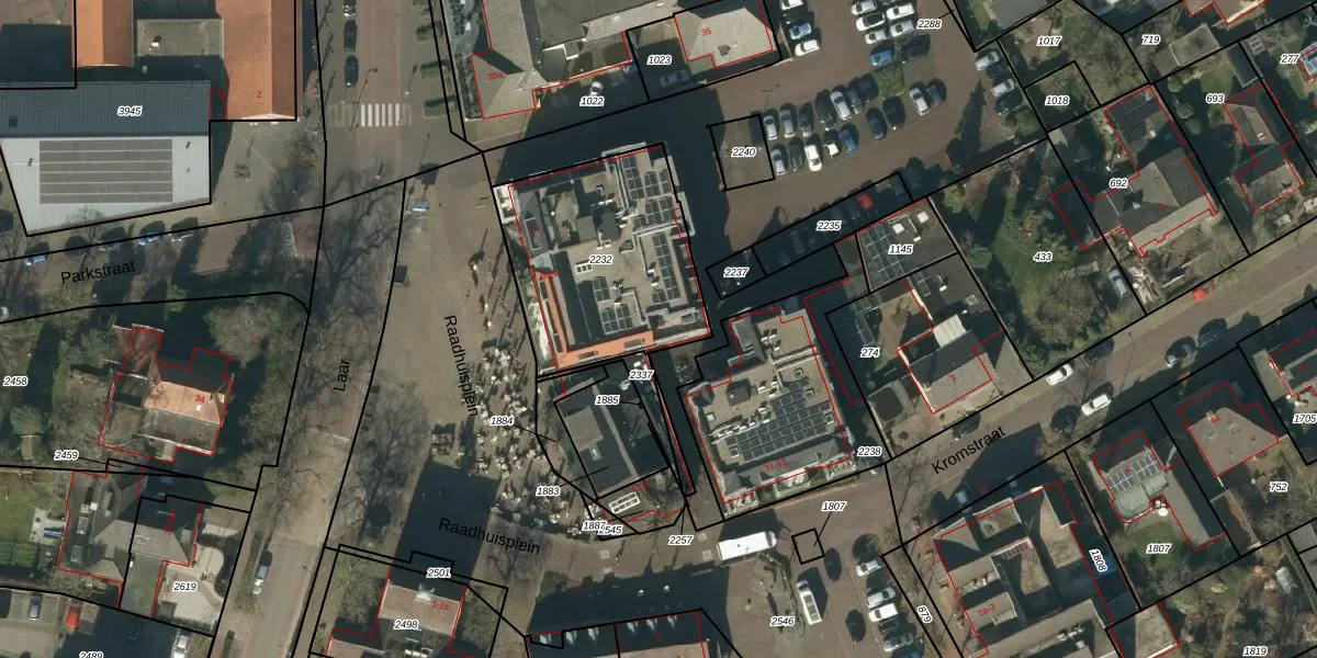 Het perceel waarop Raadhuisplein 15 staat heeft een oppervlakte van 811 m². Dit is een groot perceel. De perceeloppervlakte wordt geregistreerd door het Kadaster. Gedetailleerde informatie over de maten van dit perceel kunt u vinden in het rapport Kadastrale kaart met maatvoering van Raadhuisplein 15.