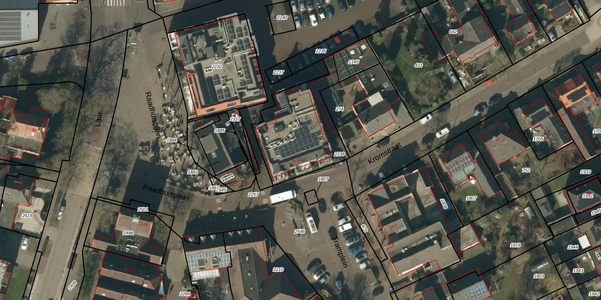 Het perceel waarop Raadhuisplein 43 staat heeft een oppervlakte van 740 m². Dit is een groot perceel. De perceeloppervlakte wordt geregistreerd door het Kadaster. Gedetailleerde informatie over de maten van dit perceel kunt u vinden in het rapport Kadastrale kaart met maatvoering van Raadhuisplein 43.