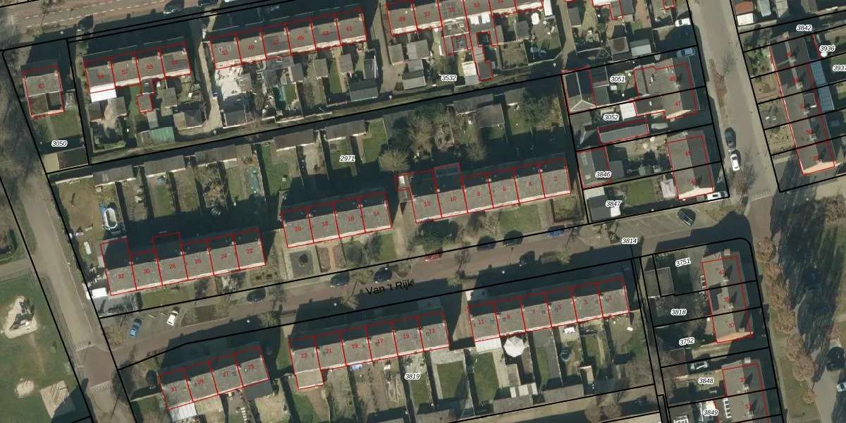 Het perceel waarop Van 't Rijk 12 staat heeft een oppervlakte van 4356 m². Dit is een zeer groot perceel. De perceeloppervlakte wordt geregistreerd door het Kadaster. Gedetailleerde informatie over de maten van dit perceel kunt u vinden in het rapport Kadastrale kaart met maatvoering van Van 't Rijk 12.