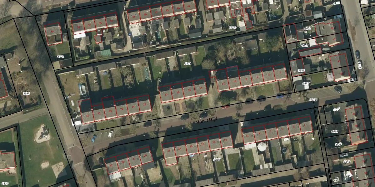 Het perceel waarop Van 't Rijk 16 staat heeft een oppervlakte van 4356 m². Dit is een zeer groot perceel. De perceeloppervlakte wordt geregistreerd door het Kadaster. Gedetailleerde informatie over de maten van dit perceel kunt u vinden in het rapport Kadastrale kaart met maatvoering van Van 't Rijk 16.