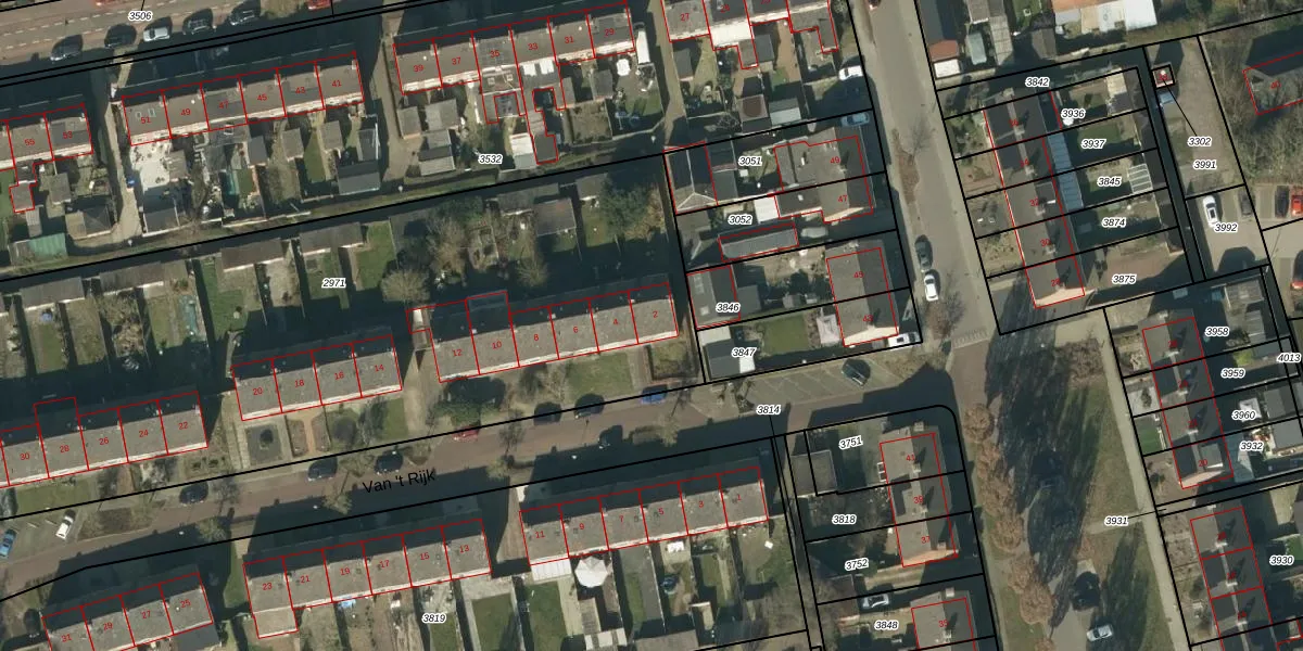 Het perceel waarop Van 't Rijk 2 staat heeft een oppervlakte van 4356 m². Dit is een zeer groot perceel. De perceeloppervlakte wordt geregistreerd door het Kadaster. Gedetailleerde informatie over de maten van dit perceel kunt u vinden in het rapport Kadastrale kaart met maatvoering van Van 't Rijk 2.