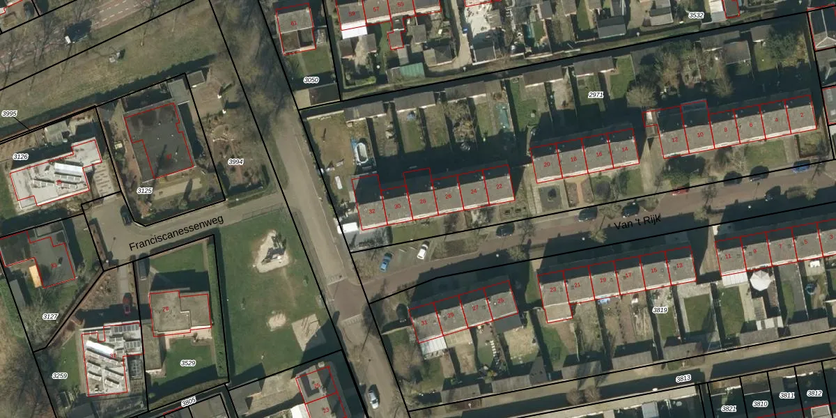 Het perceel waarop Van 't Rijk 28 staat heeft een oppervlakte van 4356 m². Dit is een zeer groot perceel. De perceeloppervlakte wordt geregistreerd door het Kadaster. Gedetailleerde informatie over de maten van dit perceel kunt u vinden in het rapport Kadastrale kaart met maatvoering van Van 't Rijk 28.