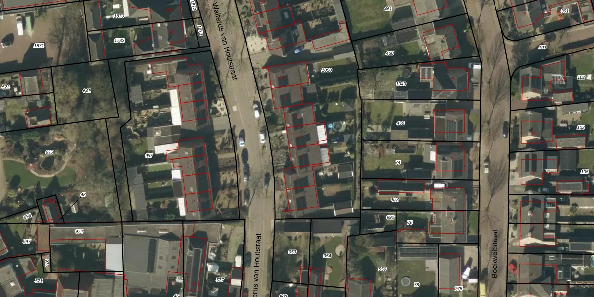 Het perceel waarop Walterus van Houtstraat 6 staat heeft een oppervlakte van 2643 m². Dit is een zeer groot perceel. De perceeloppervlakte wordt geregistreerd door het Kadaster. Gedetailleerde informatie over de maten van dit perceel kunt u vinden in het rapport Kadastrale kaart met maatvoering van Walterus van Houtstraat 6.