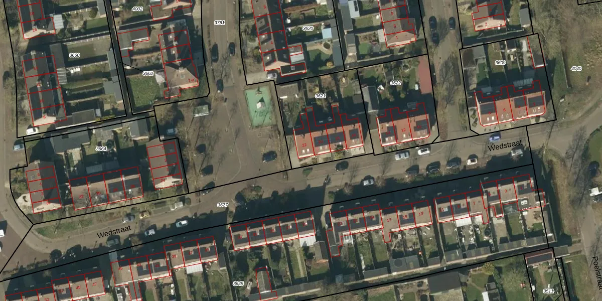 Het perceel waarop Wedstraat 22 staat heeft een oppervlakte van 802 m². Dit is een groot perceel. De perceeloppervlakte wordt geregistreerd door het Kadaster. Gedetailleerde informatie over de maten van dit perceel kunt u vinden in het rapport Kadastrale kaart met maatvoering van Wedstraat 22.