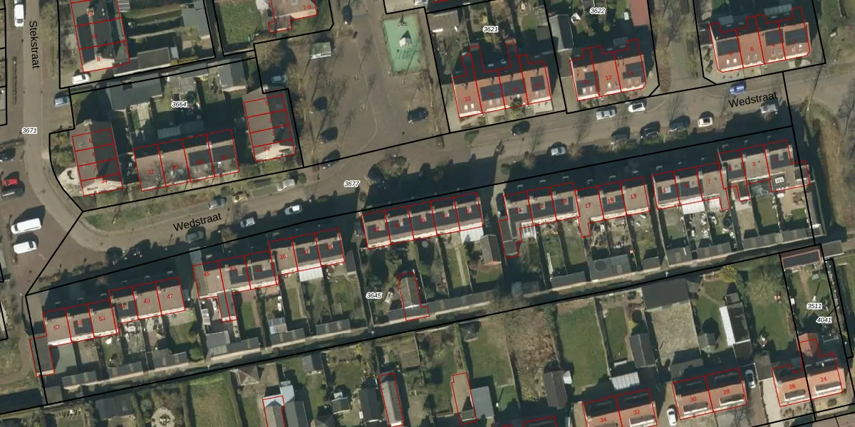 Het perceel waarop Wedstraat 29 staat heeft een oppervlakte van 5326 m². Dit is een zeer groot perceel. De perceeloppervlakte wordt geregistreerd door het Kadaster. Gedetailleerde informatie over de maten van dit perceel kunt u vinden in het rapport Kadastrale kaart met maatvoering van Wedstraat 29.