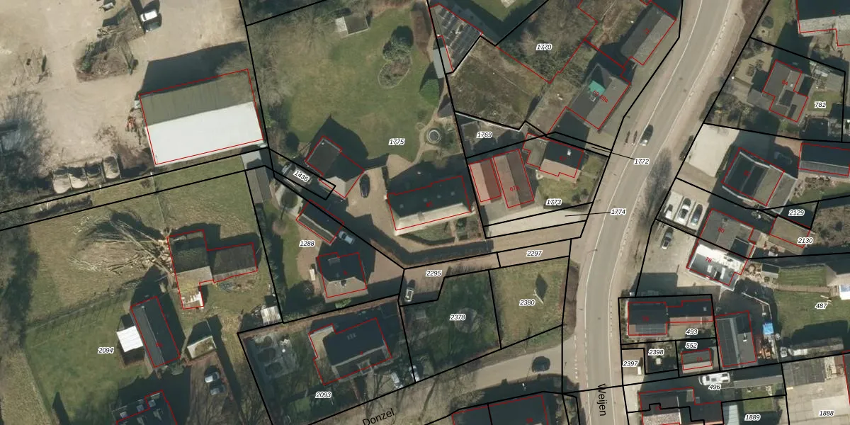 Het perceel waarop Weijen 65 staat heeft een oppervlakte van 2604 m². Dit is een zeer groot perceel. De perceeloppervlakte wordt geregistreerd door het Kadaster. Gedetailleerde informatie over de maten van dit perceel kunt u vinden in het rapport Kadastrale kaart met maatvoering van Weijen 65.