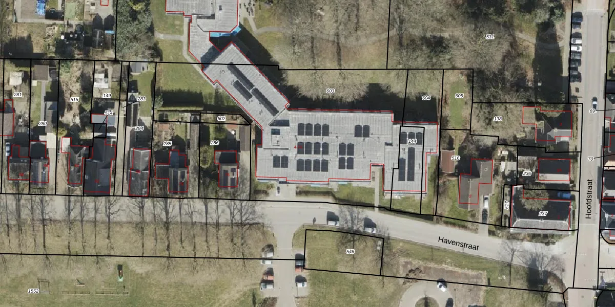 Het perceel waarop Havenstraat 16 staat heeft een oppervlakte van 2682 m². Dit is een zeer groot perceel. De perceeloppervlakte wordt geregistreerd door het Kadaster. Gedetailleerde informatie over de maten van dit perceel kunt u vinden in het rapport Kadastrale kaart met maatvoering van Havenstraat 16.