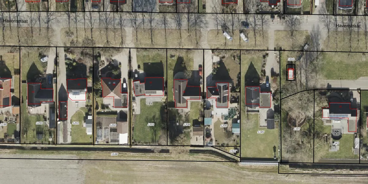 Het perceel waarop Havenstraat 35 staat heeft een oppervlakte van 1055 m². Dit is een zeer groot perceel. De perceeloppervlakte wordt geregistreerd door het Kadaster. Gedetailleerde informatie over de maten van dit perceel kunt u vinden in het rapport Kadastrale kaart met maatvoering van Havenstraat 35.