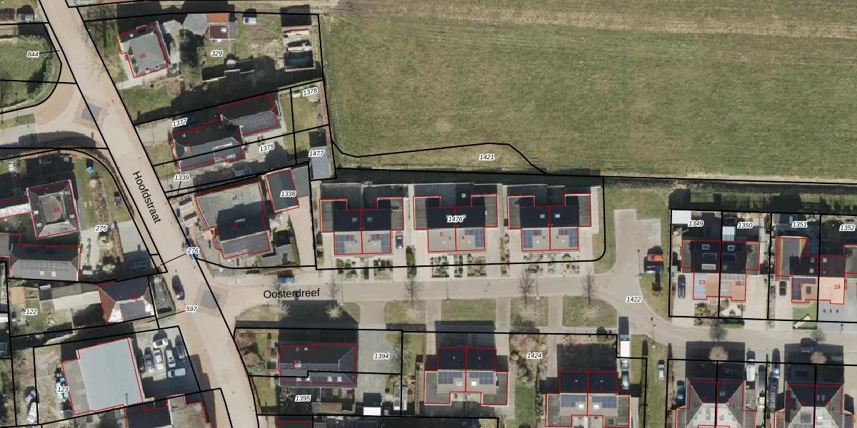 Oosterdreef 5 is gelegen op kadastraal perceel NBK01I1476. Deze kadastrale aanduiding is uniek en wordt gebruikt door het Kadaster om eigendomsrechten en andere zakelijke rechten vast te leggen. Het perceel maakt onderdeel uit van de kadastrale gemeente Noordbroek.