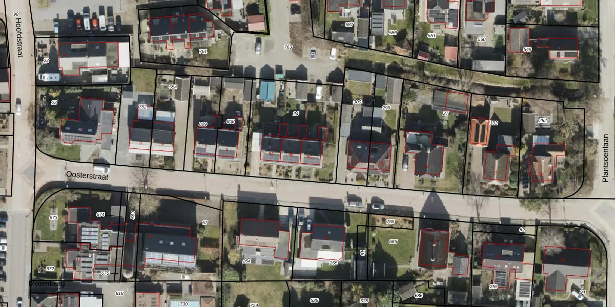 Het perceel waarop Oosterstraat 9-C staat heeft een oppervlakte van 940 m². Dit is een groot perceel. De perceeloppervlakte wordt geregistreerd door het Kadaster. Gedetailleerde informatie over de maten van dit perceel kunt u vinden in het rapport Kadastrale kaart met maatvoering van Oosterstraat 9-C.
