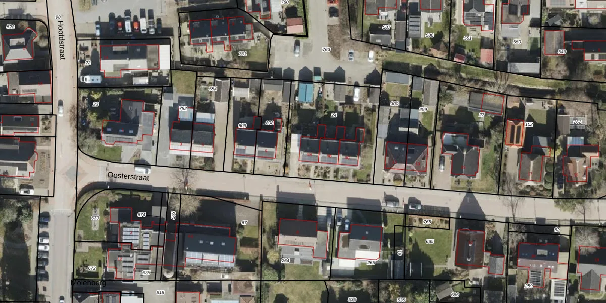 Het perceel waarop Oosterstraat 9-A staat heeft een oppervlakte van 940 m². Dit is een groot perceel. De perceeloppervlakte wordt geregistreerd door het Kadaster. Gedetailleerde informatie over de maten van dit perceel kunt u vinden in het rapport Kadastrale kaart met maatvoering van Oosterstraat 9-A.
