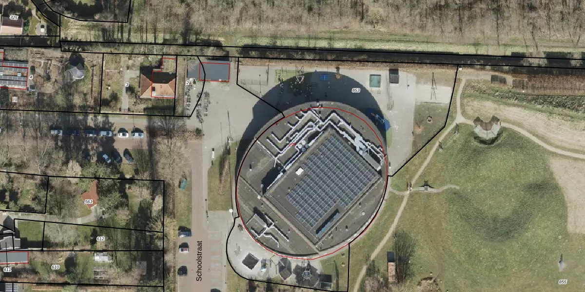 Het perceel waarop Schoolstraat 2-C staat heeft een oppervlakte van 4170 m². Dit is een zeer groot perceel. De perceeloppervlakte wordt geregistreerd door het Kadaster. Gedetailleerde informatie over de maten van dit perceel kunt u vinden in het rapport Kadastrale kaart met maatvoering van Schoolstraat 2-C.
