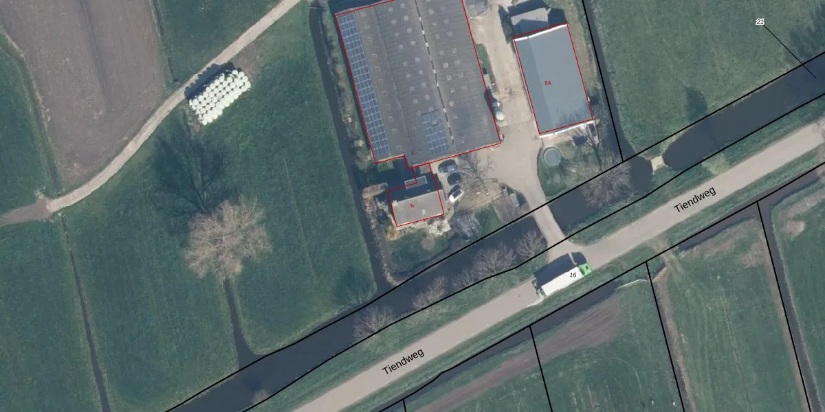 Het perceel waarop Tiendweg 6 staat heeft een oppervlakte van 21,7 ha. Dit is een zeer groot perceel. De perceeloppervlakte wordt geregistreerd door het Kadaster. Gedetailleerde informatie over de maten van dit perceel kunt u vinden in het rapport Kadastrale kaart met maatvoering van Tiendweg 6.