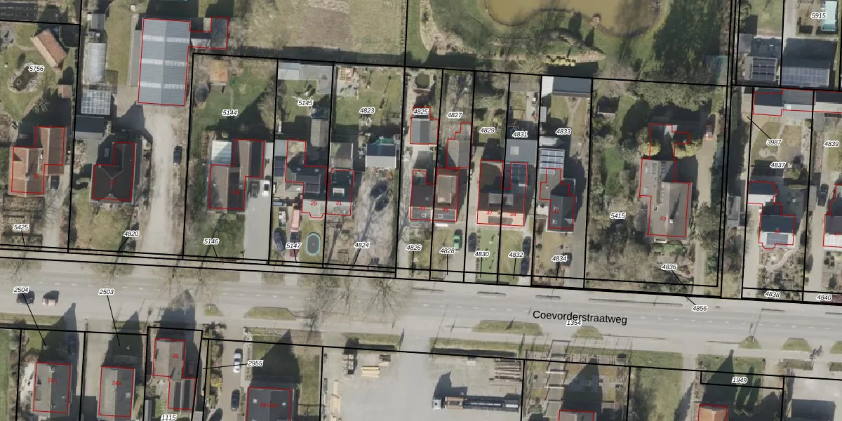 Coevorderstraatweg 33 is gelegen op kadastraal perceel HGV00B4825. Deze kadastrale aanduiding is uniek en wordt gebruikt door het Kadaster om eigendomsrechten en andere zakelijke rechten vast te leggen. Het perceel maakt onderdeel uit van de kadastrale gemeente Hoogeveen.