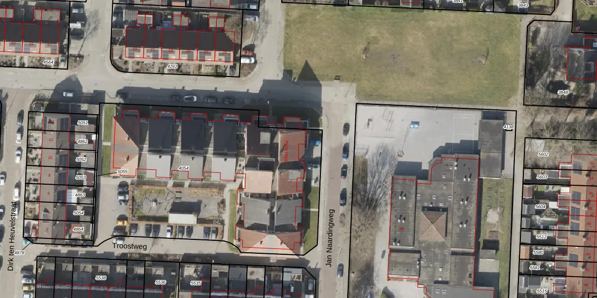 Het perceel waarop Jan Naardingweg 5-014 staat heeft een oppervlakte van 3299 m². Dit is een zeer groot perceel. De perceeloppervlakte wordt geregistreerd door het Kadaster. Gedetailleerde informatie over de maten van dit perceel kunt u vinden in het rapport Kadastrale kaart met maatvoering van Jan Naardingweg 5-014.