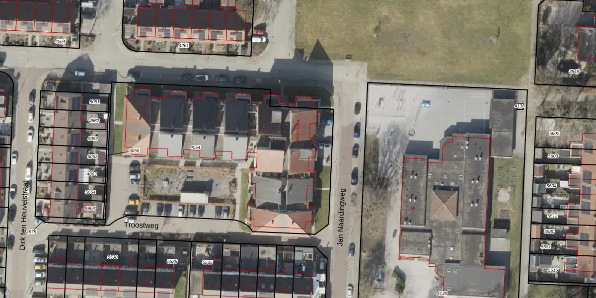 Het perceel waarop Jan Naardingweg 5-111 staat heeft een oppervlakte van 3299 m². Dit is een zeer groot perceel. De perceeloppervlakte wordt geregistreerd door het Kadaster. Gedetailleerde informatie over de maten van dit perceel kunt u vinden in het rapport Kadastrale kaart met maatvoering van Jan Naardingweg 5-111.