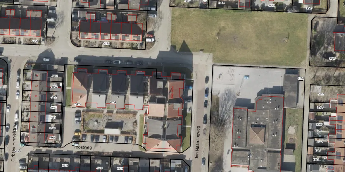Het perceel waarop Jan Naardingweg 5-115 staat heeft een oppervlakte van 3299 m². Dit is een zeer groot perceel. De perceeloppervlakte wordt geregistreerd door het Kadaster. Gedetailleerde informatie over de maten van dit perceel kunt u vinden in het rapport Kadastrale kaart met maatvoering van Jan Naardingweg 5-115.