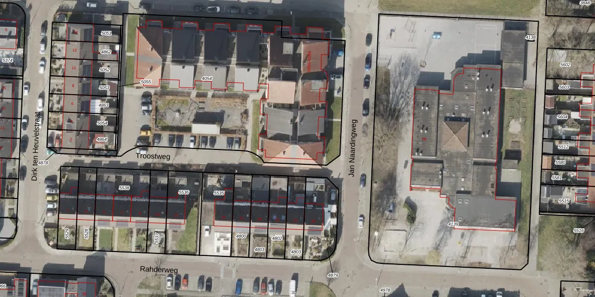Het perceel waarop Jan Naardingweg 5-201 staat heeft een oppervlakte van 3299 m². Dit is een zeer groot perceel. De perceeloppervlakte wordt geregistreerd door het Kadaster. Gedetailleerde informatie over de maten van dit perceel kunt u vinden in het rapport Kadastrale kaart met maatvoering van Jan Naardingweg 5-201.