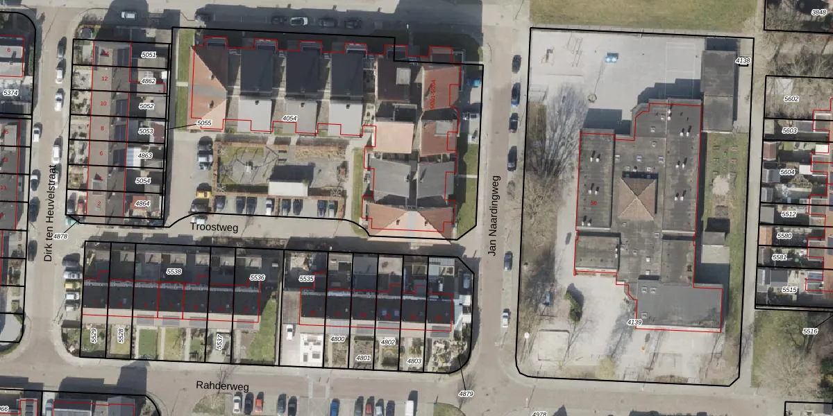 Het perceel waarop Jan Naardingweg 5-202 staat heeft een oppervlakte van 3299 m². Dit is een zeer groot perceel. De perceeloppervlakte wordt geregistreerd door het Kadaster. Gedetailleerde informatie over de maten van dit perceel kunt u vinden in het rapport Kadastrale kaart met maatvoering van Jan Naardingweg 5-202.