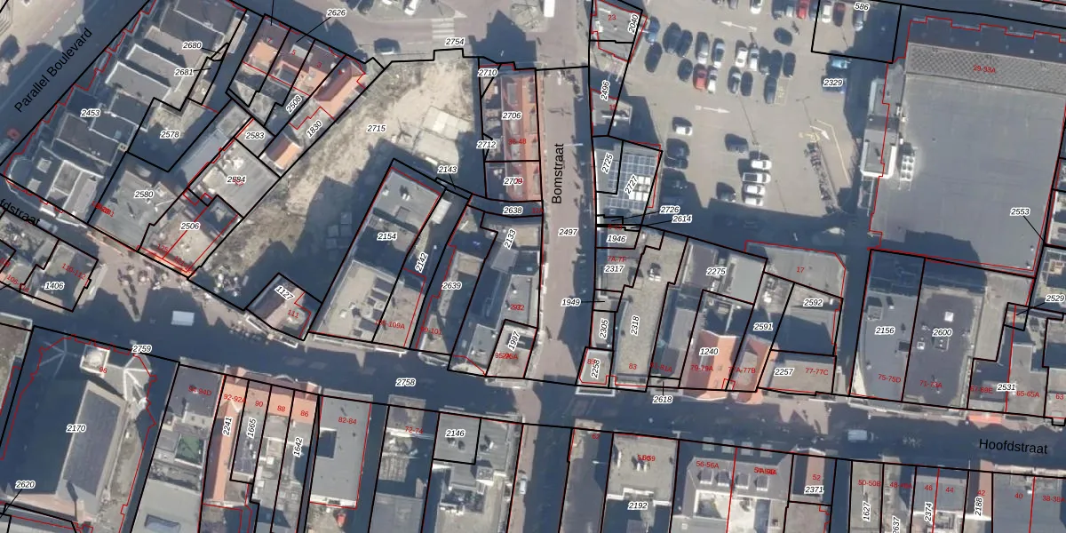 Het perceel waarop Bomstraat 16 staat heeft een oppervlakte van 313 m². Dit is een groot perceel. De perceeloppervlakte wordt geregistreerd door het Kadaster. Gedetailleerde informatie over de maten van dit perceel kunt u vinden in het rapport Kadastrale kaart met maatvoering van Bomstraat 16.