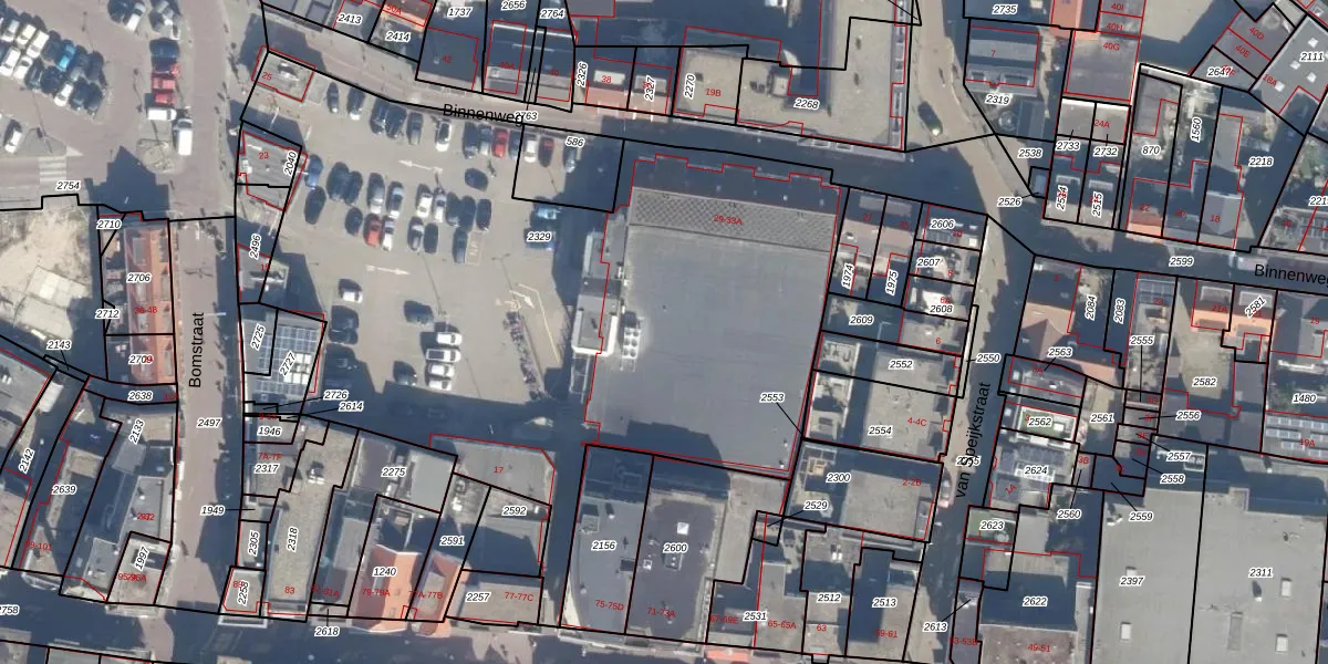 Het perceel waarop Bomstraat 19-B staat heeft een oppervlakte van 4012 m². Dit is een zeer groot perceel. De perceeloppervlakte wordt geregistreerd door het Kadaster. Gedetailleerde informatie over de maten van dit perceel kunt u vinden in het rapport Kadastrale kaart met maatvoering van Bomstraat 19-B.