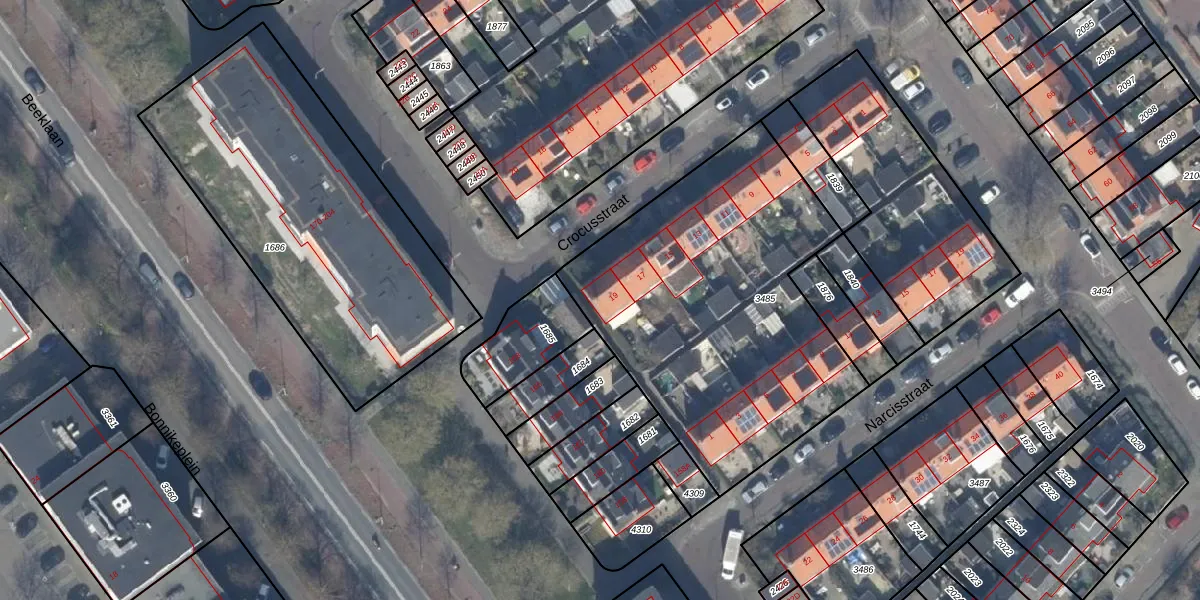 Het perceel waarop Crocusstraat 19 staat heeft een oppervlakte van 2475 m². Dit is een zeer groot perceel. De perceeloppervlakte wordt geregistreerd door het Kadaster. Gedetailleerde informatie over de maten van dit perceel kunt u vinden in het rapport Kadastrale kaart met maatvoering van Crocusstraat 19.
