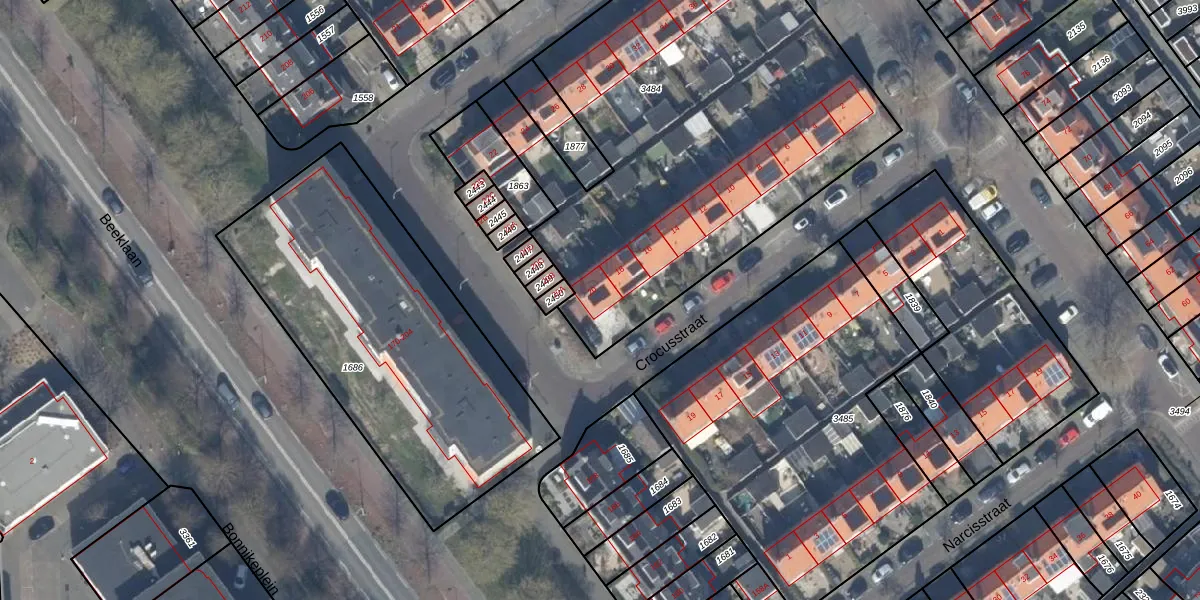 Het perceel waarop Crocusstraat 20 staat heeft een oppervlakte van 2540 m². Dit is een zeer groot perceel. De perceeloppervlakte wordt geregistreerd door het Kadaster. Gedetailleerde informatie over de maten van dit perceel kunt u vinden in het rapport Kadastrale kaart met maatvoering van Crocusstraat 20.