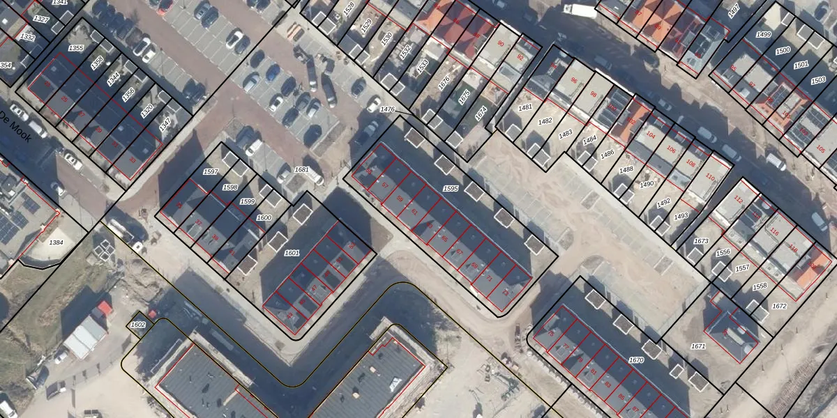 Het perceel waarop De Mook 61 staat heeft een oppervlakte van 1040 m². Dit is een zeer groot perceel. De perceeloppervlakte wordt geregistreerd door het Kadaster. Gedetailleerde informatie over de maten van dit perceel kunt u vinden in het rapport Kadastrale kaart met maatvoering van De Mook 61.