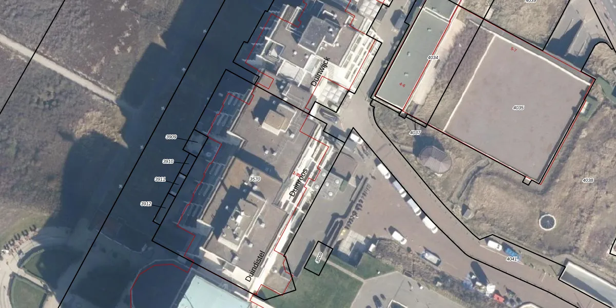 Het perceel waarop Duinroos 39 staat heeft een oppervlakte van 2612 m². Dit is een zeer groot perceel. De perceeloppervlakte wordt geregistreerd door het Kadaster. Gedetailleerde informatie over de maten van dit perceel kunt u vinden in het rapport Kadastrale kaart met maatvoering van Duinroos 39.