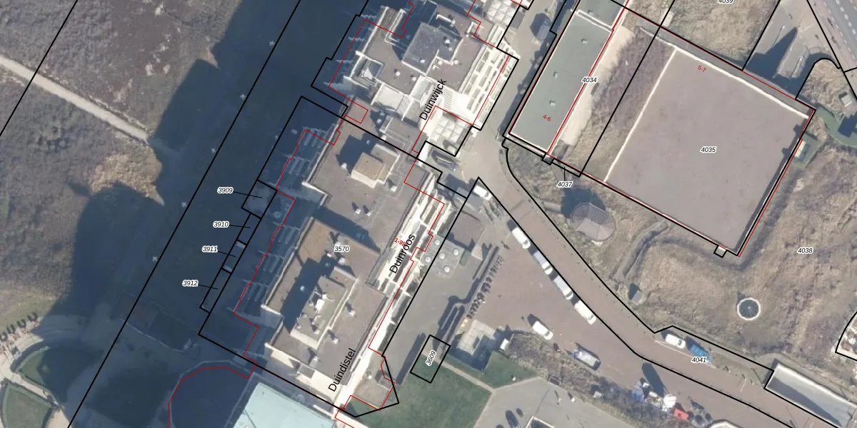 Het perceel waarop Duinroos 59 staat heeft een oppervlakte van 2612 m². Dit is een zeer groot perceel. De perceeloppervlakte wordt geregistreerd door het Kadaster. Gedetailleerde informatie over de maten van dit perceel kunt u vinden in het rapport Kadastrale kaart met maatvoering van Duinroos 59.