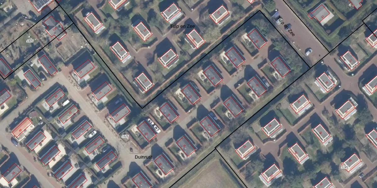 Het perceel waarop Duinrust 17 staat heeft een oppervlakte van 1,3 ha. Dit is een zeer groot perceel. De perceeloppervlakte wordt geregistreerd door het Kadaster. Gedetailleerde informatie over de maten van dit perceel kunt u vinden in het rapport Kadastrale kaart met maatvoering van Duinrust 17.