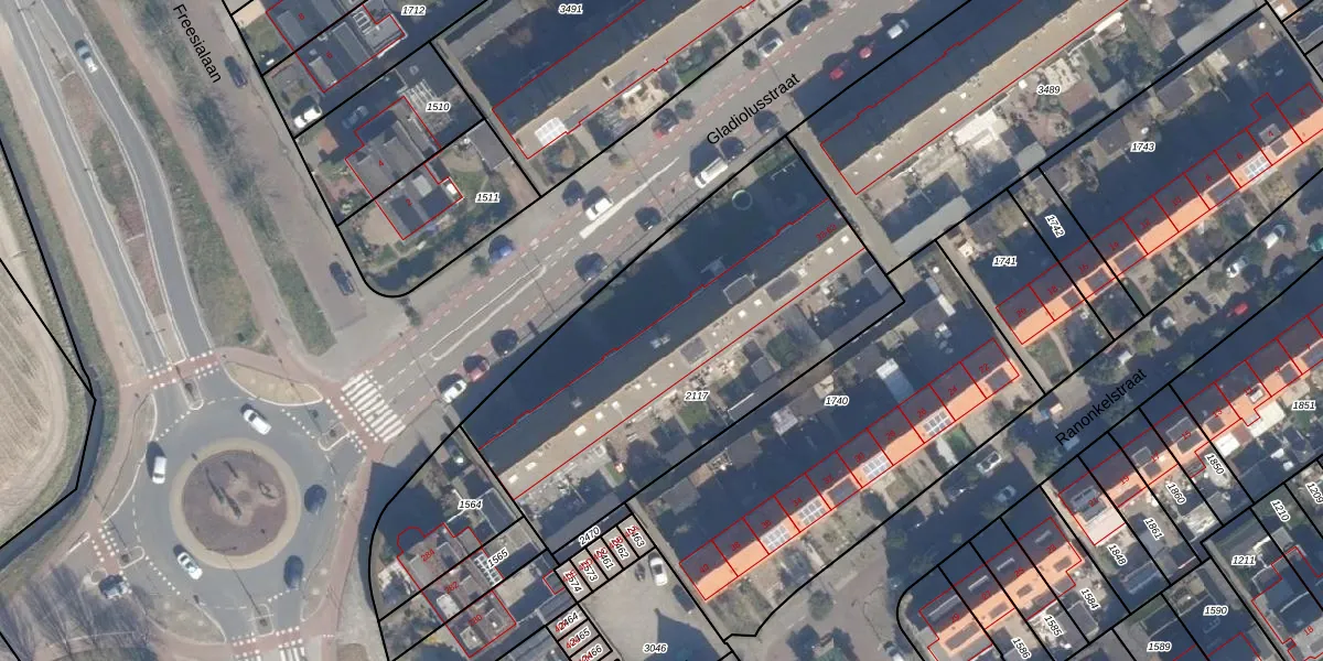 Het perceel waarop Gladiolusstraat 49 staat heeft een oppervlakte van 1857 m². Dit is een zeer groot perceel. De perceeloppervlakte wordt geregistreerd door het Kadaster. Gedetailleerde informatie over de maten van dit perceel kunt u vinden in het rapport Kadastrale kaart met maatvoering van Gladiolusstraat 49.
