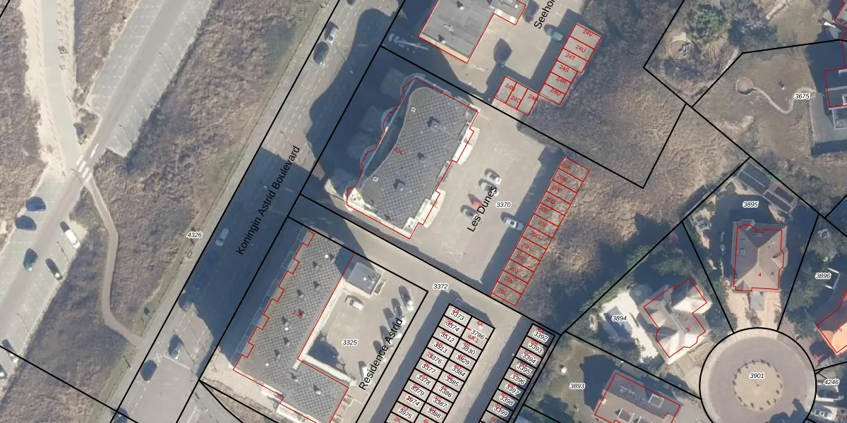 Het perceel waarop Les Dunes 21-J staat heeft een oppervlakte van 3402 m². Dit is een zeer groot perceel. De perceeloppervlakte wordt geregistreerd door het Kadaster. Gedetailleerde informatie over de maten van dit perceel kunt u vinden in het rapport Kadastrale kaart met maatvoering van Les Dunes 21-J.